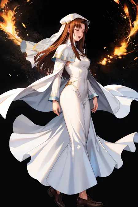 要呈现她的典型外观,请添加 "头环、面纱、白色连衣裙、短斗篷"。
