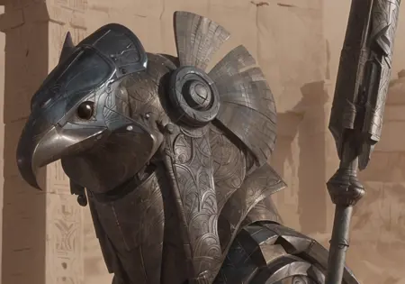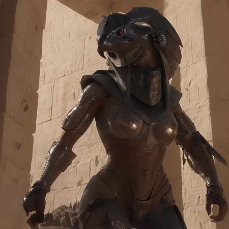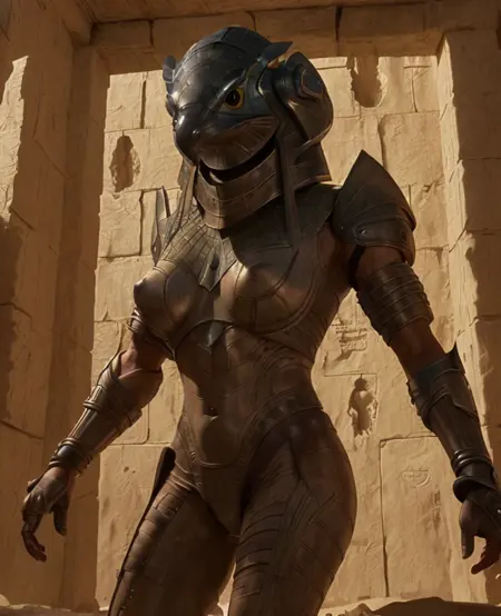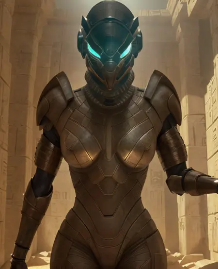 Horus guard from the 1994 movie Stargate. All images are made by the deliberate model and have female gender swaps. The LROA is pretty strong so weights below 0.5 are recommended. use the prompt words staff to get a staff, and gauntlet to get the clawed gauntlets. Works great with Samus Armor. This model is easier to work with than the Aubis model.