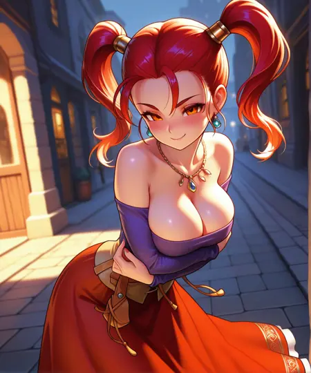 オレンジ色の目、長い髪、赤髪、ツインテール、中程度の胸