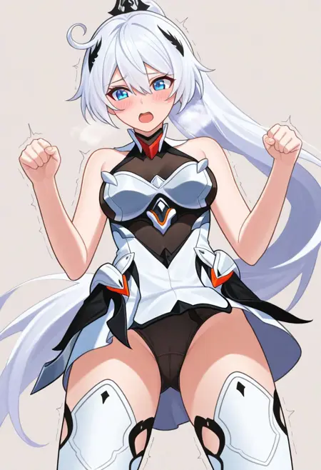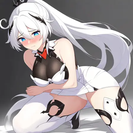 트리거: 1girl, solo, KiaHofs, 흰 머리카락, 아호게, 파란 눈, 눈 사이의 머리카락, 긴 머리카락, 단발, 검은 머리 장식, 검은 왕관, 빨간 머리카락 줄무늬
