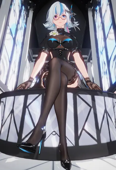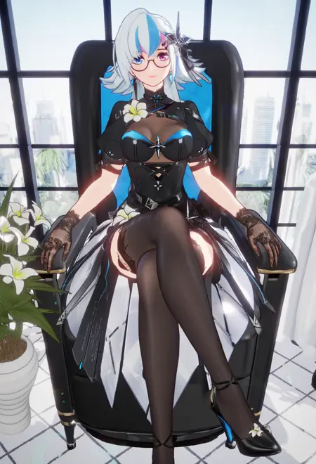 paluodi, 1girl, solo, short sleeves, breasts, gloves, closed mouth, puffy sleeves, glasses, dress, jewelry, pantyhose, black gloves, black dress, skirt, semi-rimless eyewear, heterochromia, full body, flower, under-rim eyewear, looking at viewer, white flower, see-through, black thighhighs, highheels