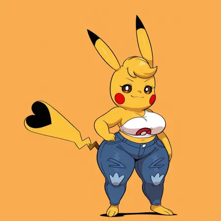 pikachu, yellow fur, short hair, red cheeks, black pupils, brown sclera, long ears, tail, black tail tip, large breasts, wide hips,