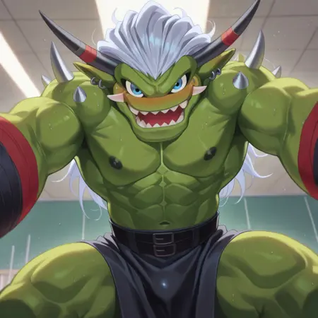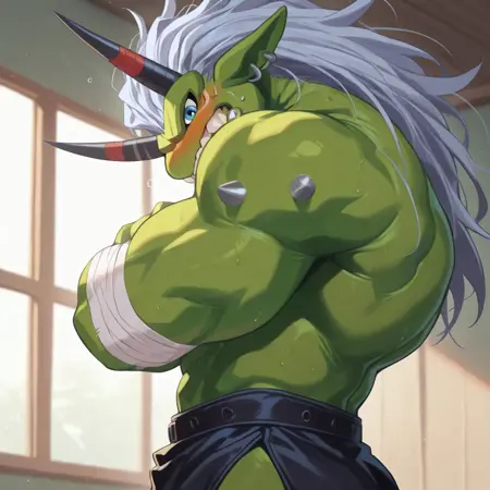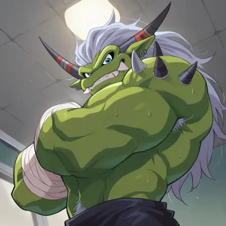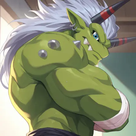*Character generation prompt: Ogremon, digimon, green skin, blue eyes, long white hair, teeth, open mouth, no nose, bandages, loincloth, black loincloth, horns, black horns