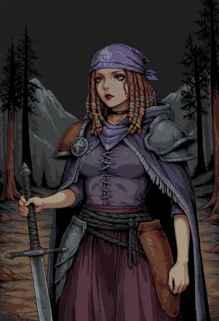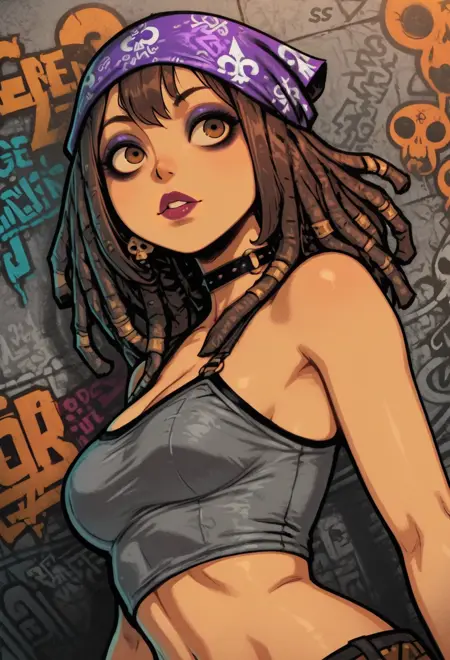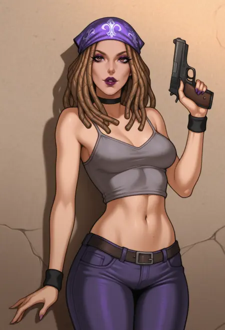 ss-funshsr2-illu, 茶色の目, 茶色の髪, メイク, リップスティック, 前髪, 長いダレロックス, 紫のバンダナ, 黒のチョーカー, グレーのトップス, 腹部, へそ, 紫のジーンズ, ベルト,