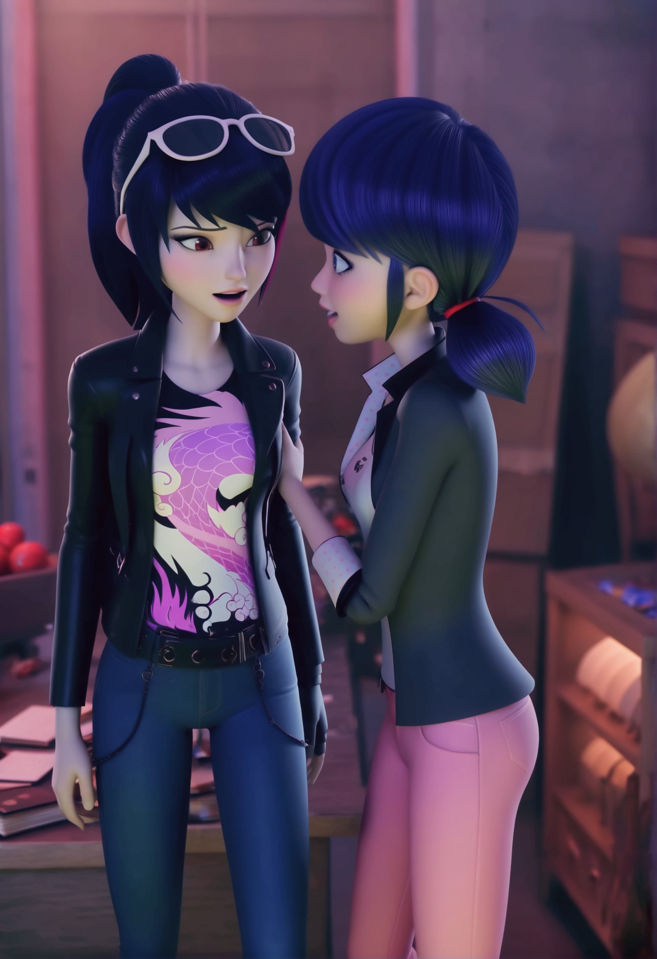 プロンプト:2girl、2人の女の子キャラクター、最初の女の子はポニーテール、赤い目、黒い髪、多色の髪、ストライプ入りの髪、赤い髪の束、頭に眼鏡、サングラス;