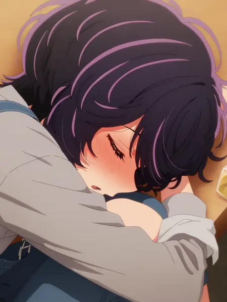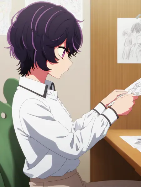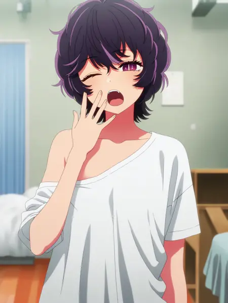 Abiko_Samejima, 紫色の目, 紫色の髪, 短髪, 1girl, シングル, 前髪, 目の間の髪, 詳細な目, 縦長の瞳孔