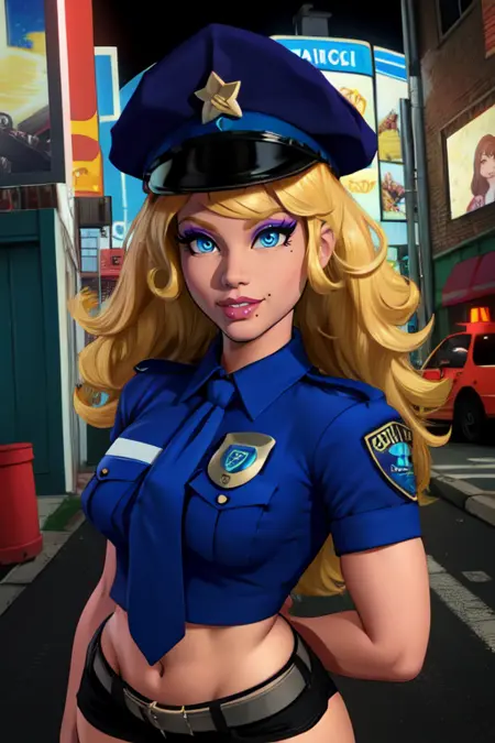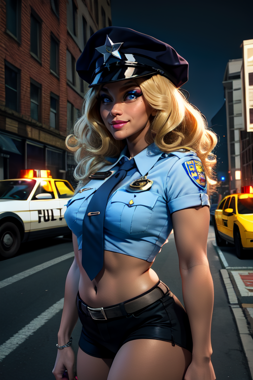 경찰 유니폼, 경찰 모자, 복부, 검은 짧은 반바지, 파란 신발, 파란 넥타이