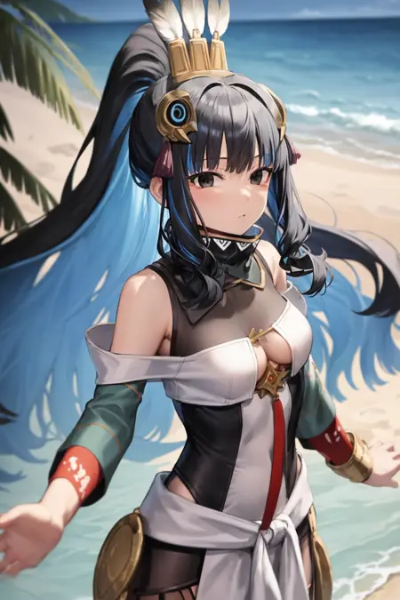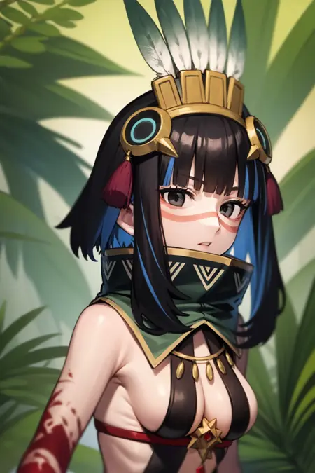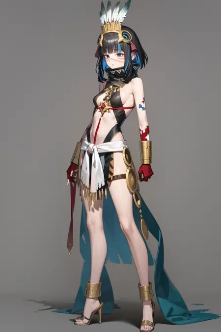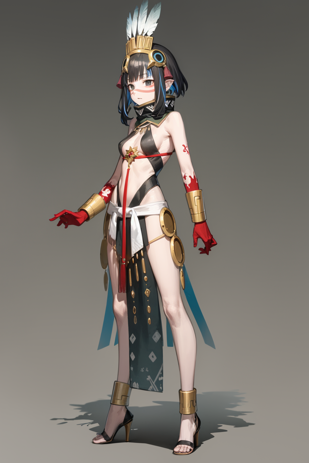 その他のプロンプト:黒髪、青髪、多色髪、前髪、短髪、黒目、フェイスペイント、顔の模様、羽、髪飾り、頭飾り、ハイヒール、ジュエリー、肌見せの服、タトゥー
