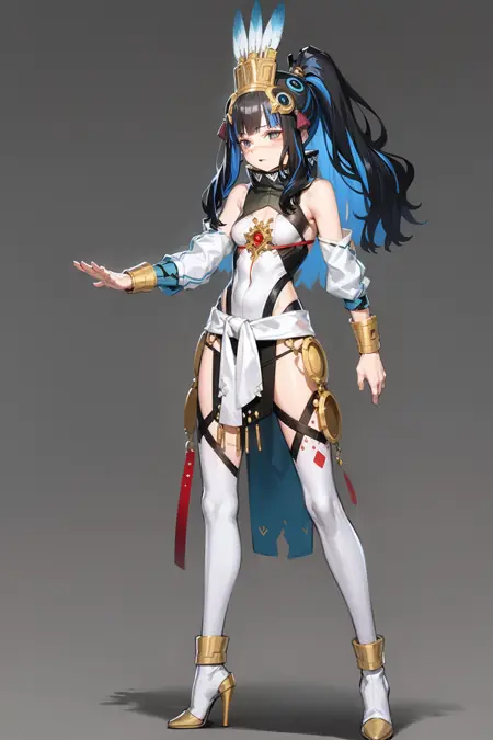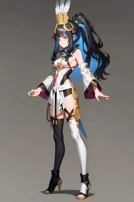その他のプロンプト:黒髪、青髪、長髪、多色髪、ツートーン髪、ポニーテール、長袖、分離袖、白いハイソックスブーツ、白いドレス、ハイヒール