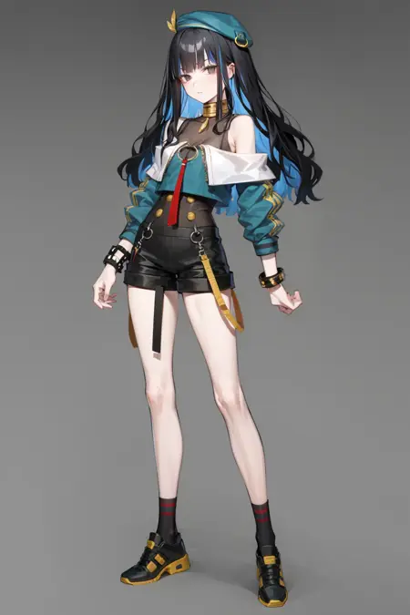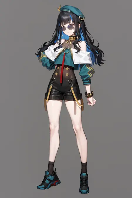 その他のプロンプト:ストライプ髪、黒髪、青髪、多色髪、ツートーン髪、長髪、前髪、サングラス、肩出し、ベレー帽、黒い靴下、黒いショートパンツ、黒い靴下、ブレスレット、ジュエリー、長袖
