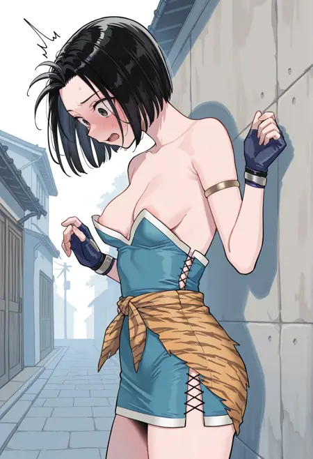 short hair, black hair, black eyes, short dress, cross-laced clothes, clothes around waist, tiger print, armlet, fingerless gloves