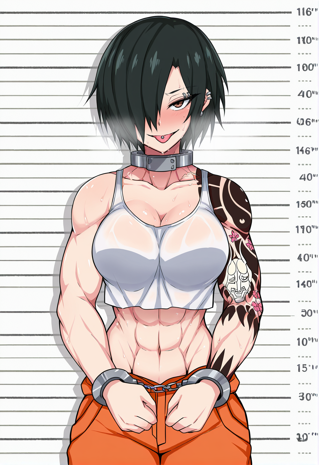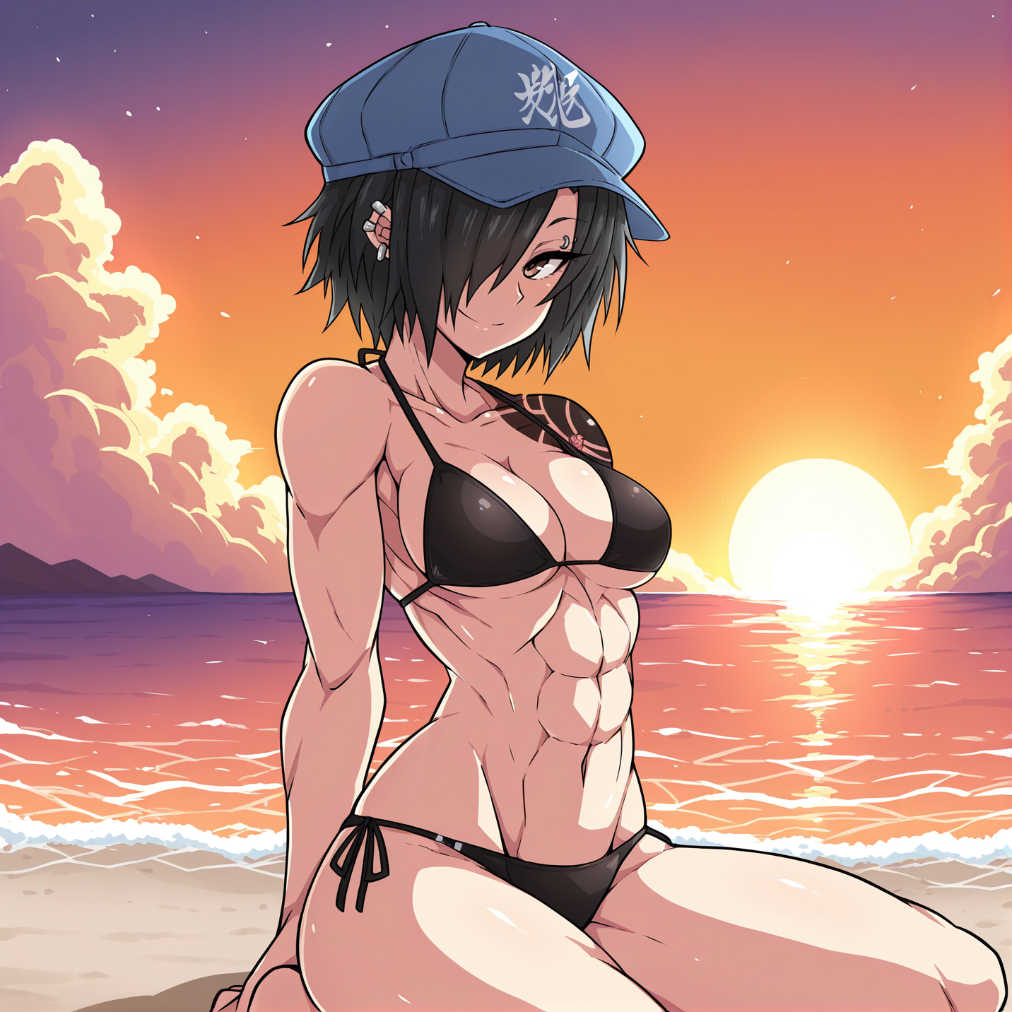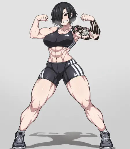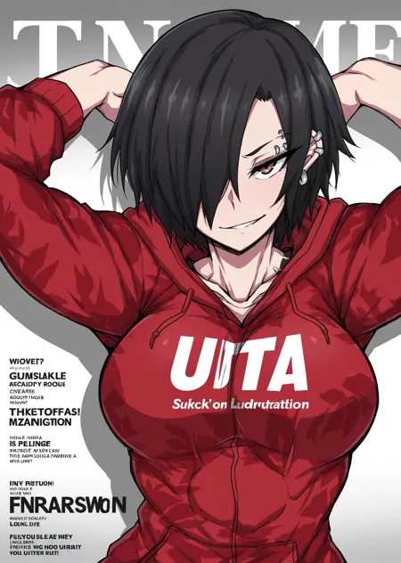 触发词:yuk0mma、黑发、短发、一缕头发遮住眼睛、旱魃臂纹身、腹肌、肌肉发达、棕色眼睛、大乳房、耳钉、舌钉、眉钉