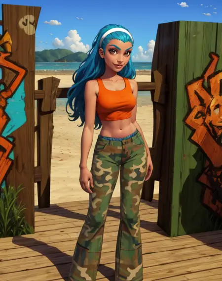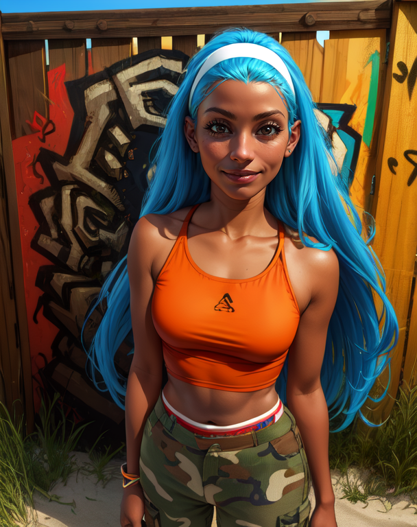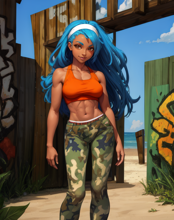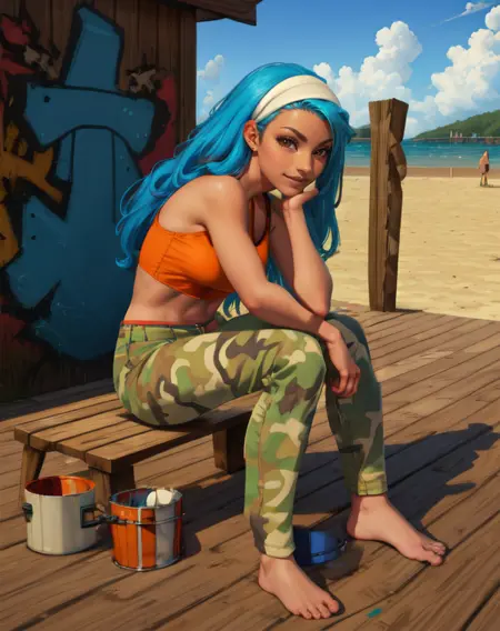 orange top, white hair band, camouflage pants, midriff, bandaged feet,