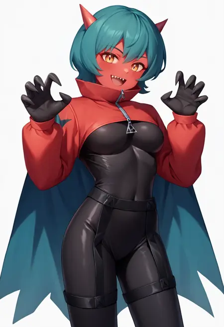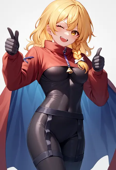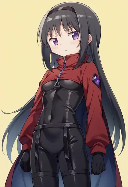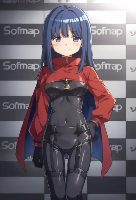 RRB_Cosplay, ツートーンのマント, 赤いマント, 青いマント, 長袖, 黒いボディスーツ, 黒い手袋, ジッパー, 腹巻きカバー, 黒いガーター, 赤い脚のプレート, 黒いスニーカー, プラットフォームスニーカー