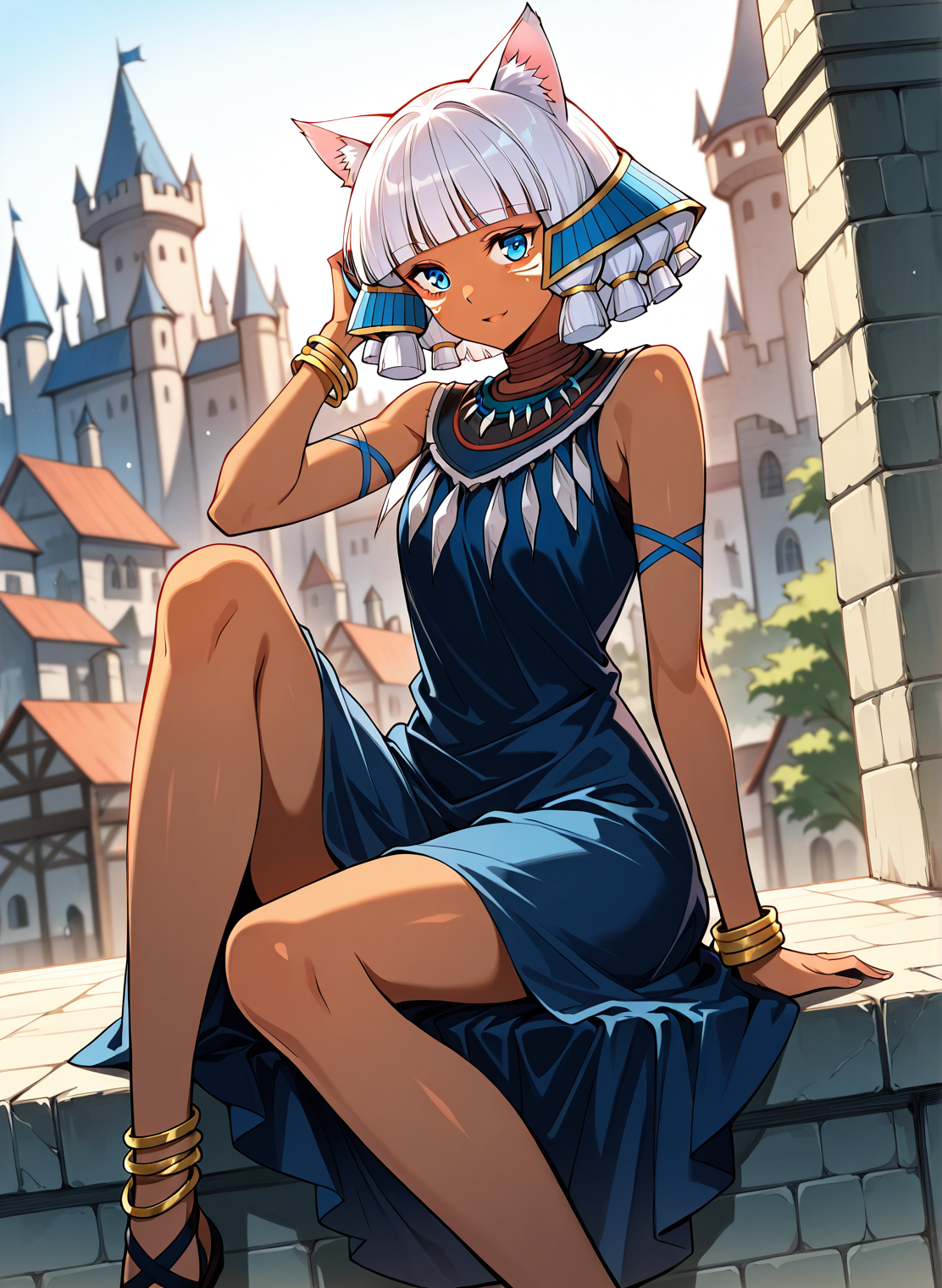 1 girl, solo, animal ears, cat ear, dark skin, dark-skinned female, white hair, bangs, blunt bangs, short hair, facial mark, blue eyes, hair tubes