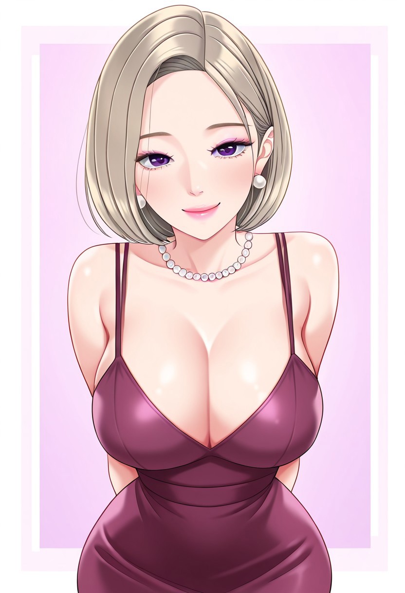 ソンウ・チョンサ: sunwoo_cheon-sa、鋭い濃い紫色の目、美しいプラチナブロンドの髪、美しいショートボブカット、巨大でふわふわした胸