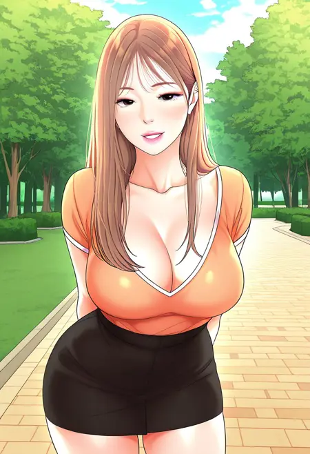 チャ・ミソン: cha_mi-sun、美しい茶色の目、美しい茶色の髪、低いロングポニーテール、巨大でふわふわした胸