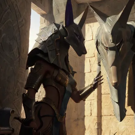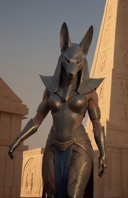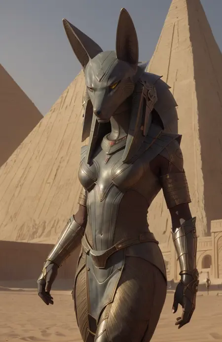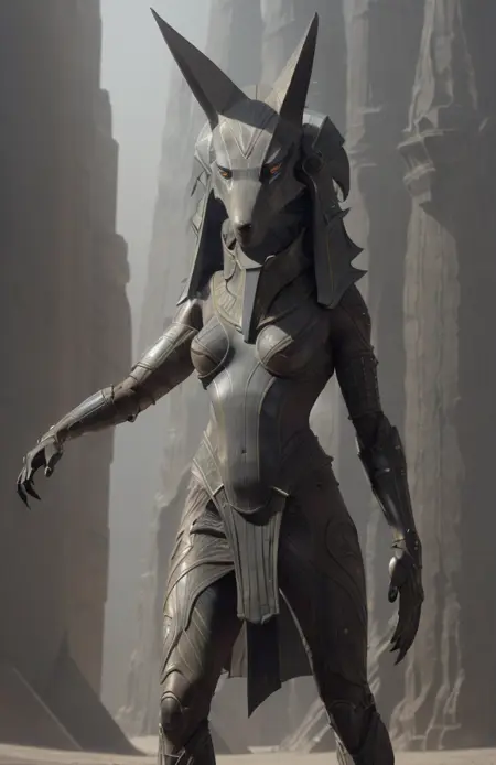 1994年电影《星际之门》中的阿努比斯守卫。所有图像均由deliberate模型生成,并进行了女性性别替换。LROA效果较强,建议权重低于0.5。使用提示词“staff”可获得法杖,使用“gauntlet”可获得带爪护手。与萨姆斯装甲搭配效果极佳。由于可用训练数据较少,该模型比荷鲁斯模型更难使用。建议使用ControlNet进行姿态控制,例如在已有的类似阿努比斯的图像上使用深度模型。