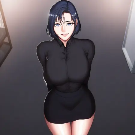 김선주: kim_seon-ju, 아름다운 보라색 눈, 아름다운 검은 머리, 토끼 꼬리, 앞머리 개방형 커튼, 거대하고 어수선한 가슴, 검은 프레임 안경, 또는/아름다운 긴 머리
