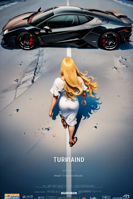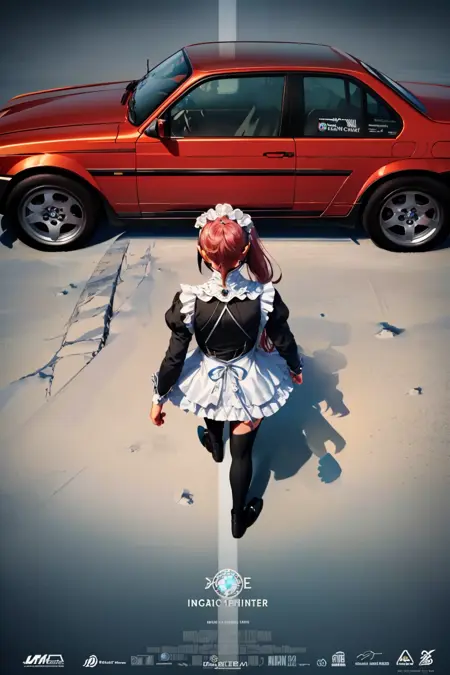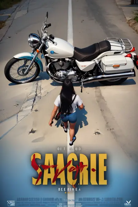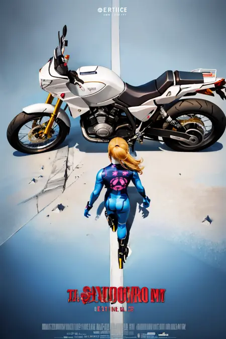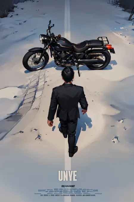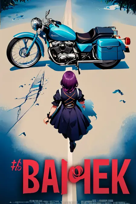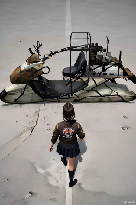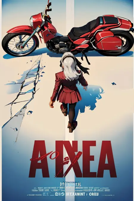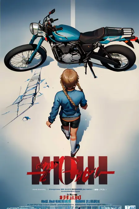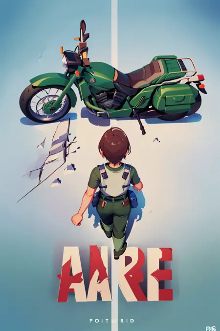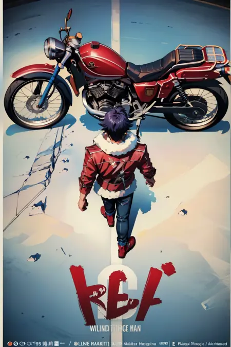 トリガー+追加タグ: akiraposter, 上から, 後ろから, 歩いている, 地上車両, バイク