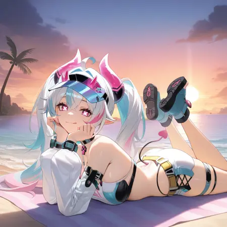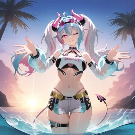JetavieSWM, 白髪, ツインテール, 多色髪, ピンクストライプ髪, ストライプ髪, 青ストライプ, ピンクストライプ, ピンクストライプ髪, X字型の瞳, ピンクの目, ブラックビキニ, ビキニ, ピンクの角, 衣装の下にビキニ, ハルターネック, ブラックチョーカー, ペンダントチョーカー, スパゲッティストラップ, ビザー帽, オープンベルト, アームストラップ, 角, 尾, クロップトップ, パンティストラップ, 白いクロップトップ, ベルト, ハーネス, サイレス, 外れた袖, 透けた袖, フラッシャーの長い袖, ウィストベルト, 黄色のベルト, 複数のベルト, 白いショートパンツ, 交差リボンで結んだショートパンツ, 白いシャツ, 短いショートパンツ, ピンクの太ももストラップ, 青い靴, アンクルブーツ, 足先のない靴,