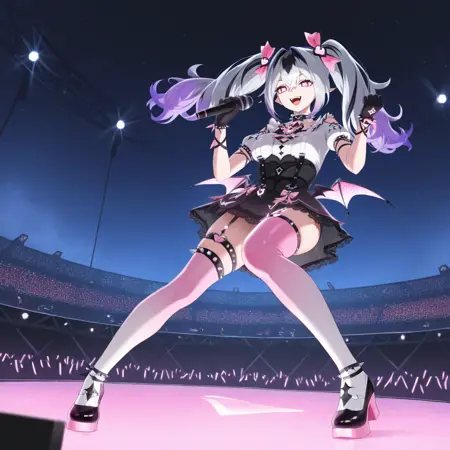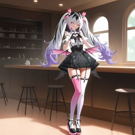 Jetavie,Jt_Pnk,粉红眼睛,X形瞳孔,多色发,紫色发,渐变发,双马尾,不对称腿部穿搭,灰发,黑发挑染,黑发,发带,披肩,荷叶边领,分离领,白色领子,黑色蝴蝶结,丝带蝴蝶结,粉色蝴蝶结,尖刺项圈,白色衬衫,荷叶边衬衫,蓬松短袖,露肩设计,渔网连体衣,透明露胸,胸下部,黑色裙子,另类荷叶边裙,蕾丝镶边裙,吊袜带,粉红色过膝袜,渐变过膝袜,白色过膝袜,黑色手套,手套,丝带镶边手套,粉红丝带,低垂翅膀,心形发饰,尖刺大腿带,多条大腿带,大腿吊袜带,彩色鞋底,厚底鞋履,黑色鞋子,