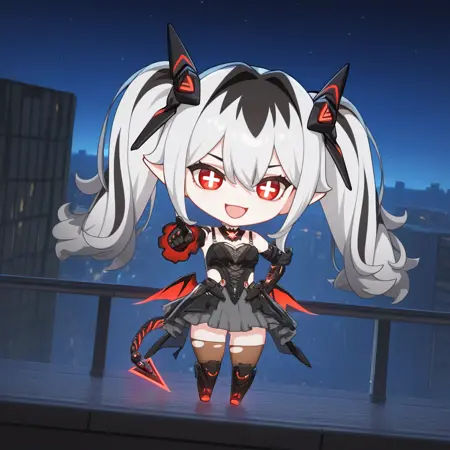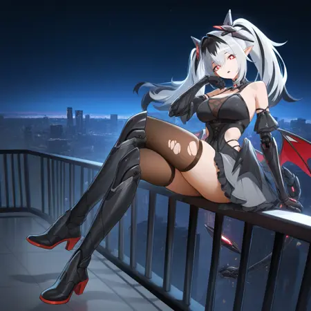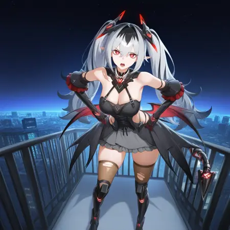 Jetavie,Jt_Def,尖耳,红眼,X形瞳孔,多色发,双马尾,灰发,挑染发,黑发,黑色手套,肘部手套,头饰,低垂翅膀,发饰,O型带,机械尾,肩带,黑色颈环,露肩,交叉系带紧身胸衣,黑色紧身胸衣,黑色连衣裙,露胸,无袖连衣裙,侧开叉,分离袖子,荷叶边袖子,长袖,黑色袖子,黑色护腕,黑色丝带,荷叶边裙,多层裙,黑色裙,灰色裙,撕裂的过膝袜,靴下过膝袜,棕色过膝袜,大腿靴,机械腿,黑色鞋履,机械臂,