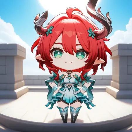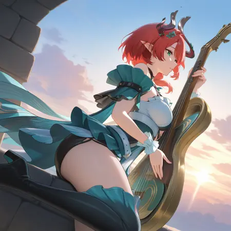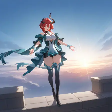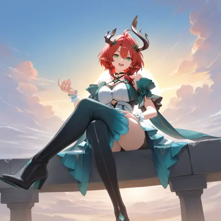 Ciaccona, 녹색 눈, 뾰족한 귀, 붉은 머리, 단발, 비대칭 뿔, 머리 장신구, 옆으로 묶은 머리, 짧은 드레스, 주름진 손목 장식, 흰색 손목 장식, 흰 드레스, 다색 드레스, 청록색 드레스, 보석, 어깨 드러난 드레스, 드러난 어깨, 청록색 소매, 짧은 소매, 넓은 소매, 투명한 소매, 층층이 이어진 소매, 옷의 컷아웃 디자인, 허벅지 부츠, 주름진 신발, 그라디언트 부츠, 그라디언트 치마, 흰 치마, 주름진 치마, 청록색 치마, 검은 숏팬츠, 짧은 팬츠, 치마 아래 숏팬츠, 흰 벨트, 장신구, 하이넥, 검은 목걸이,