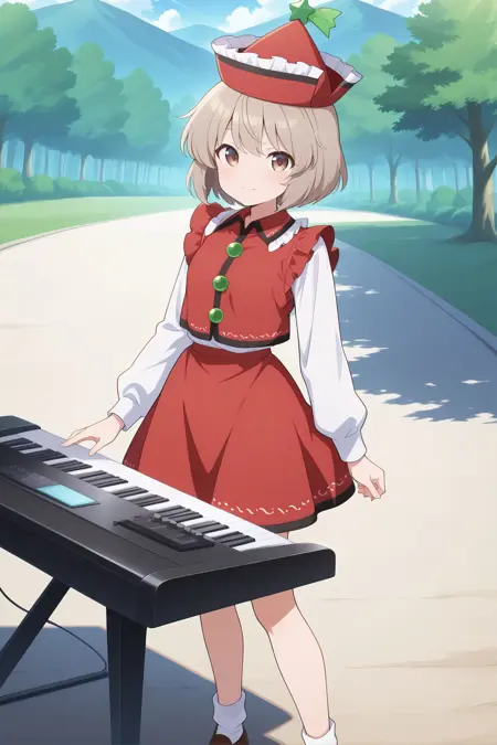 red hat, frilled hat, star hat ornament, red vest, white shirt, long sleeves, red skirt, white socks, brown footwear,