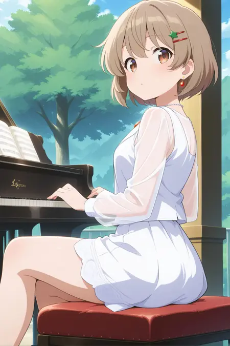 lyrica prismriver, 1girl, solo, brown eyes, brown hair, short hair, lyrica prismriver \(white organist\), alternate costume, earrings, hairclip, white vest, white shirt, long sleeves, see-through shirt, wedding dress, short skirt, necklace, white dress, pendant,