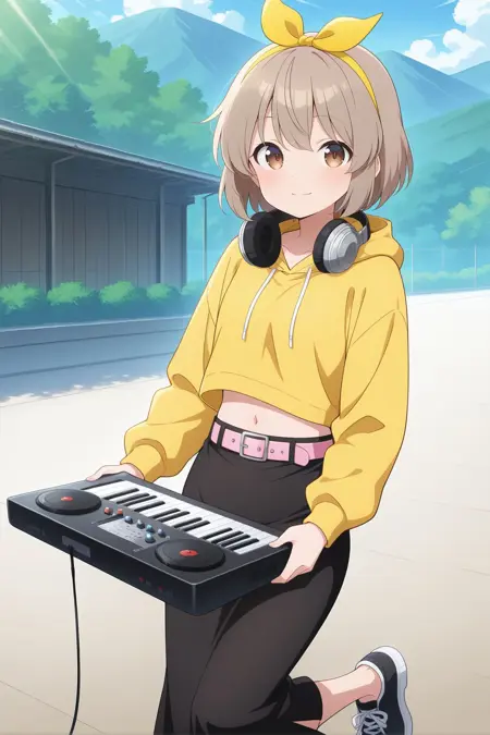 lyrica prismriver, 1girl, solo, brown eyes, brown hair, short hair, lyrica prismriver \(youngest memory leaker sister\), alternate costume, yellow hairband, hair bow, grey headphones, headphones around neck, yellow hoodie, hood, long sleeves, navel, pink belt, black skirt, pencil skirt, long skirt, black sneakers, mixing console,