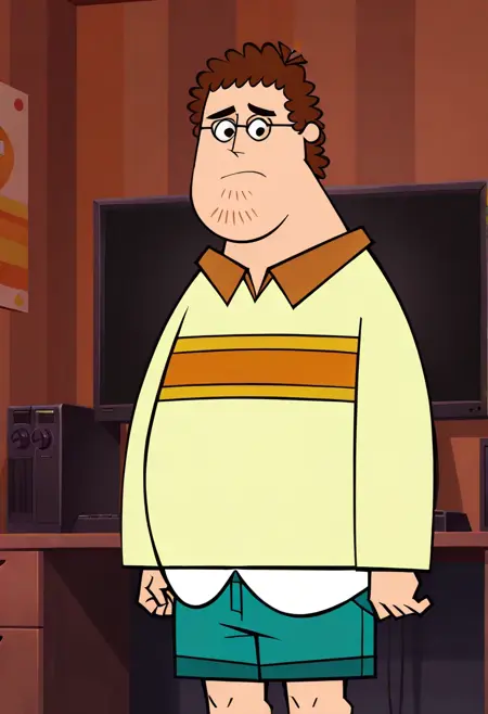SamTDROTI, 1boy, curly brown hair, black glasses, brown mustache stubble, pale yellow sweater with orange and green stripes, white shirt, teal shorts, brown shoes, white socks, black eyes, fat, chubby