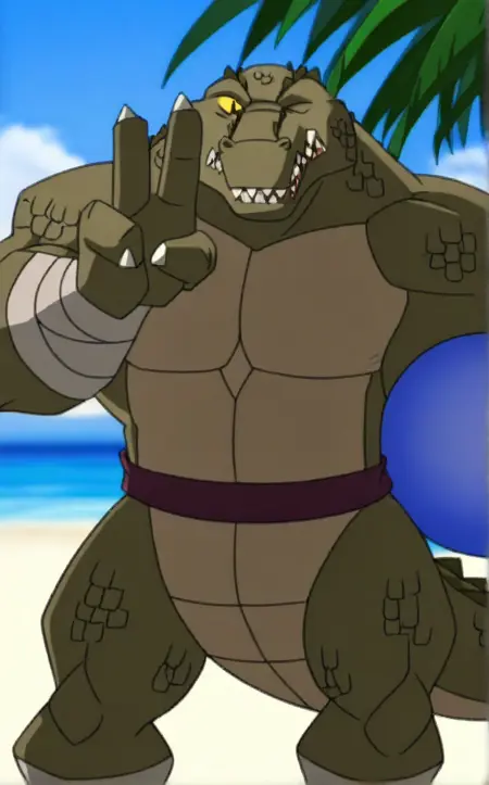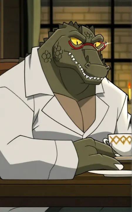 모든 버전 - 좁은 동공, 빨간 프레임 안경, 둥근 안경, 색상이 있는 피부, 악어, 악어류, 날카로운 이빨, 안경, 비늘, 녹색 피부, 발톱, 꼬리, 대머리