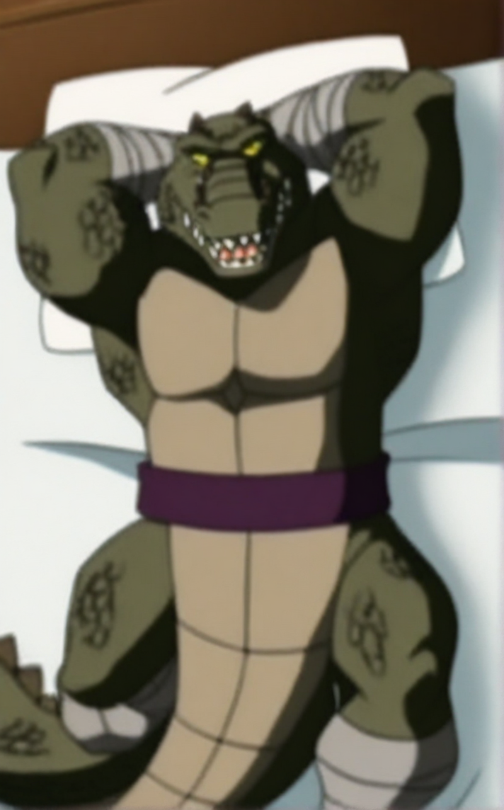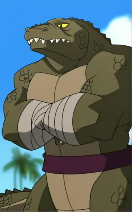 Main_Leatherhead - 복장과 실험복 없이, 허리띠와 발목, 손목을 감싸는 붕대만 착용한 레더헤드