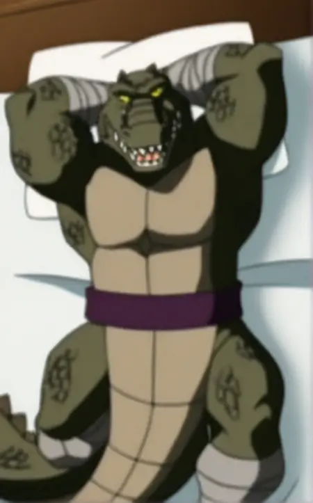 Main_Leatherhead - Leatherhead without his suit and lab coat, just the waistband and bandage wrapping around his ankles and wrists