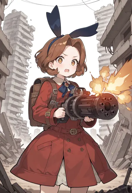 Notable tags: brown hair, brown eyes. short hair, red coat, hairband, backpack,