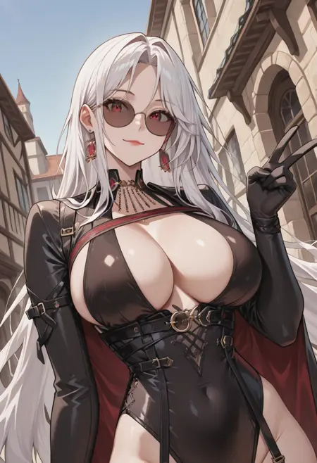 spectre_neo,1girl,solo,白发,长发,极长发,红眼睛,大乳房,深V领,黑色紧身衣,高开衩紧身衣,腰带,黑色手套,黑色过膝袜,渔网袜,吊袜带,高跟靴,及膝靴,黑色鞋履,珠宝,耳环,太阳镜,口红,黑色斗篷,