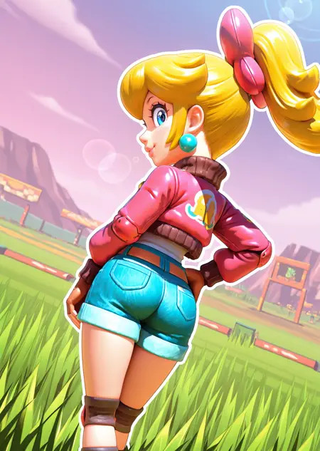 默认服装:oms_mariokartworld_peach,1个女孩,金发,蓝眼睛,耳环,露指手套,珠宝,马尾辫,粉色蝴蝶结,夹克,白衬衫,牛仔短裤,腰带,护膝,靴子