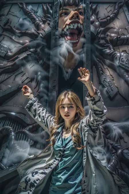 可选提示: 站在大门前,大门正面朝向,阴影,被拉入大门,雾气,触手,伸出手