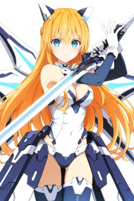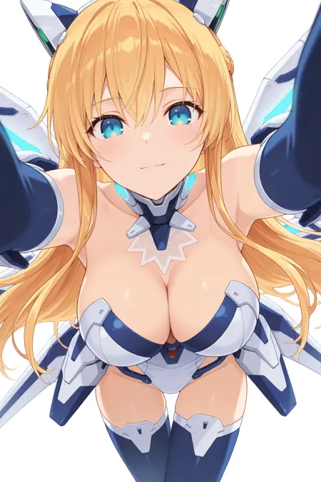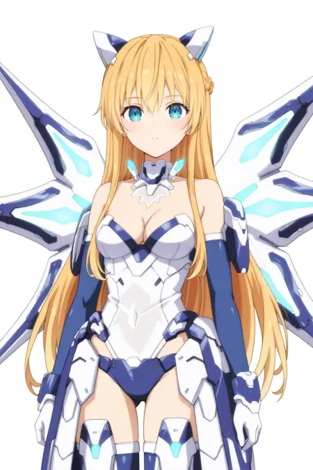 CRUNIT, mecha_musume, bare shoulders, hair ornament, armor, blue_elbow_gloves, white_gloves, white leotard, cleavage_cutout, thighhighs, mechanical_wings