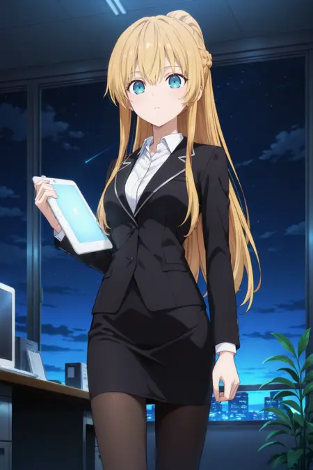 half updo, white shirt, collared_shirt, black_blazer, black_skirt, pencil_skirt, pantyhose,