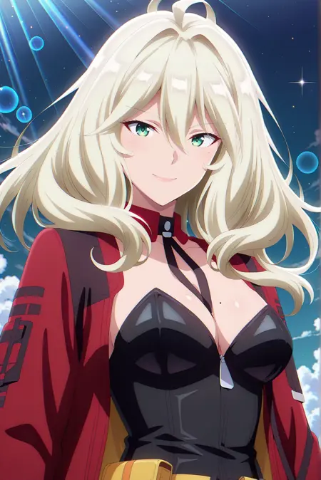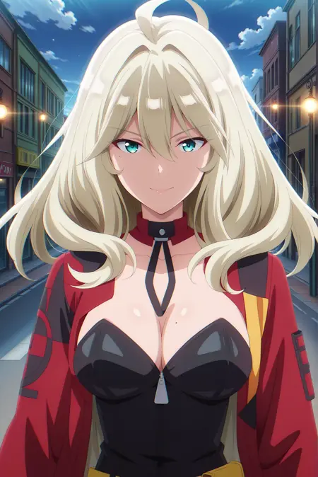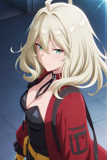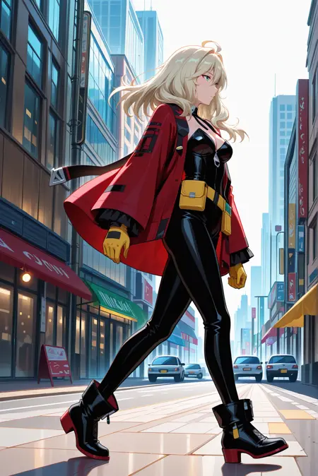 默认服装: 红色夹克,敞开式夹克,黄色手套,黑色紧身衣,无肩带,露胸,黄色腰带包,可拆卸领子,黑色鞋履,踝靴