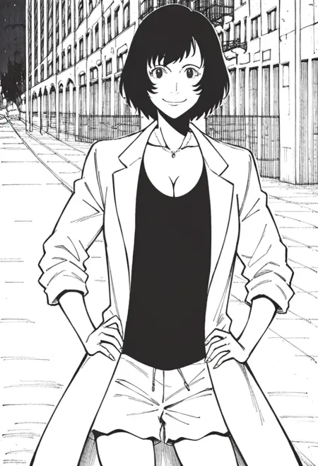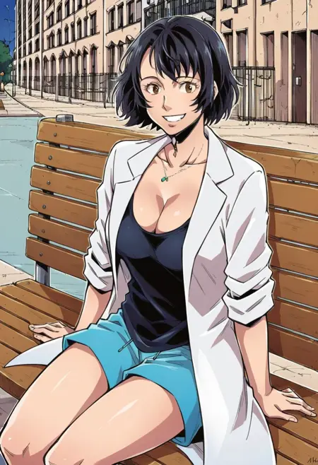 Outfit1: labcoat, black shirt, shorts, black footwear,cleavage, necklace,