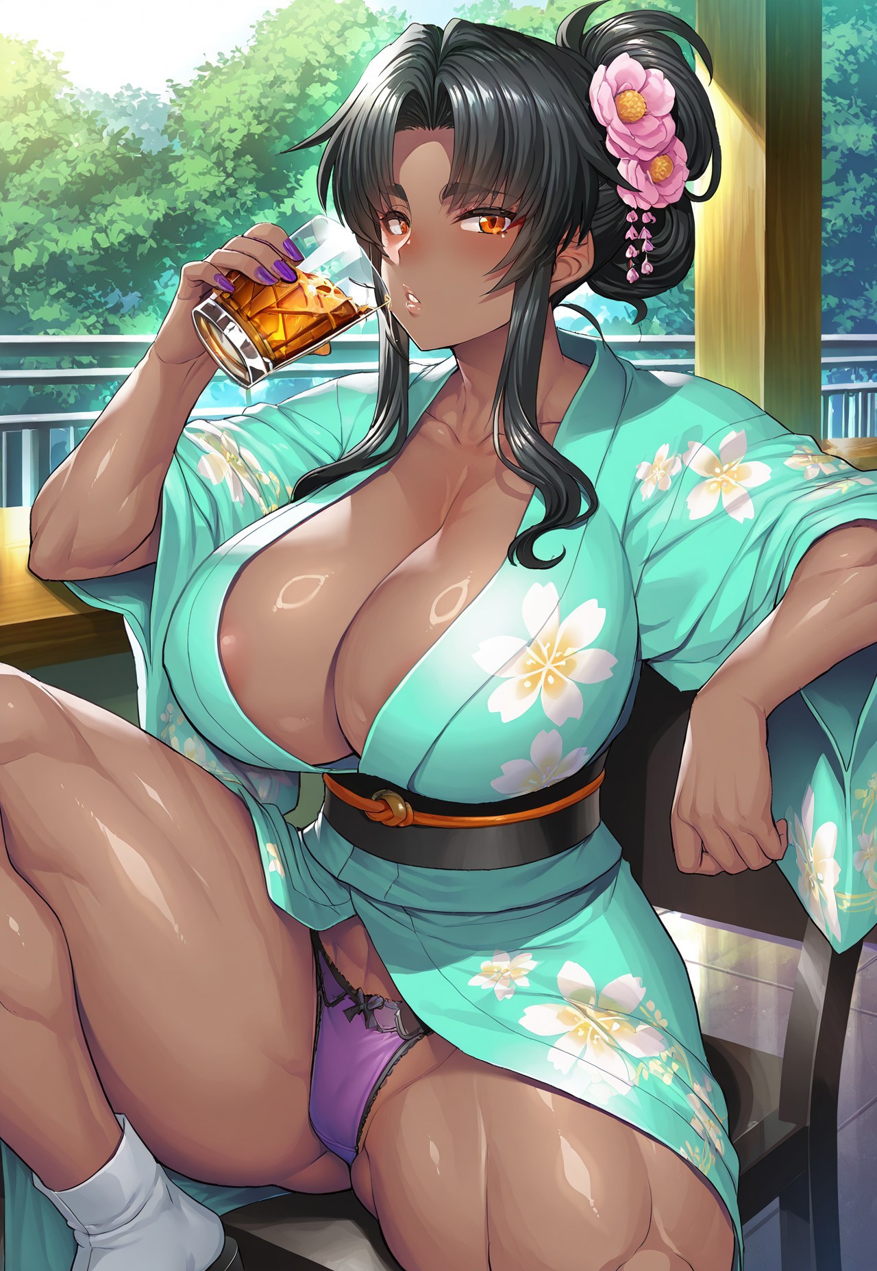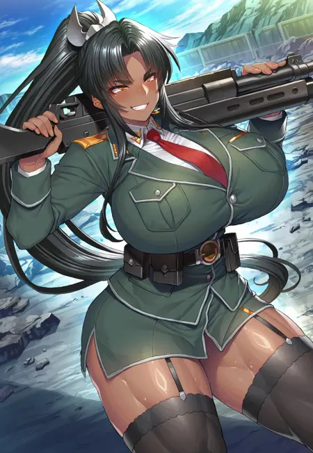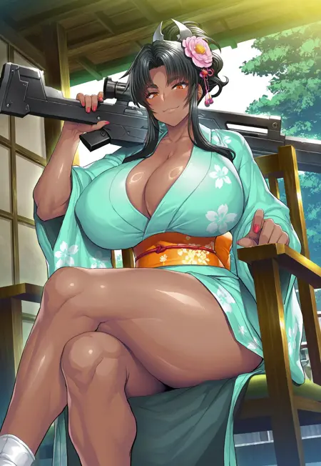 태그: 미라벨 벨, 매우 긴 머리, 중간 갈라진 앞머리, 옆머리, 검은 머리, 높은 플랫테일, 어두운 피부, 검은 피부 여성, 복근, 허벅지, 주황색 눈, 근육질 여성, 날씬한 허리, 곡선미, 거대한 가슴, 반짝이는 피부