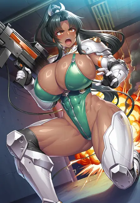 1번째 옷: 갑옷, 어깨 보호대, 어깨 갑옷, 녹색 레오파드, 하이레그 레오파드, 가슴 노출, 갑옷으로 된 하의, 장갑, 가슴 노출, 측면 유방 노출, 지퍼