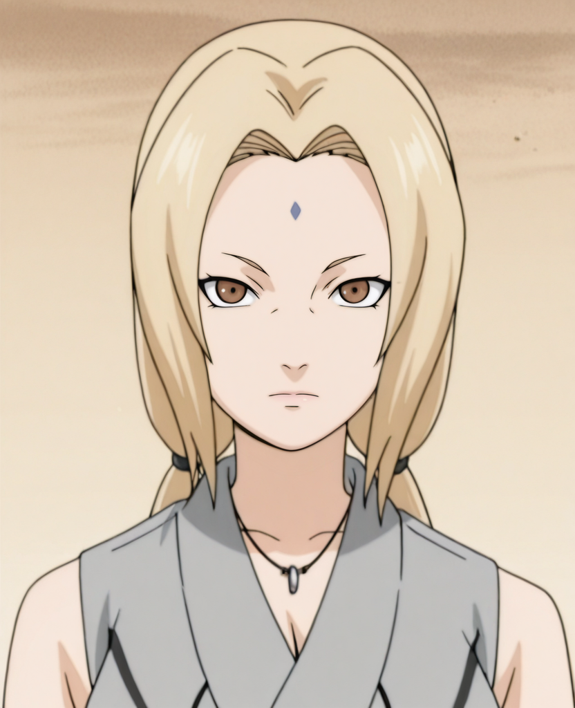 tsu1, 1girl, brown eyes, blonde hair, forehead mark, sleeveless kimono, sash, necklace, twintails, medium breasts, tsunade, pants, toeless footwear,