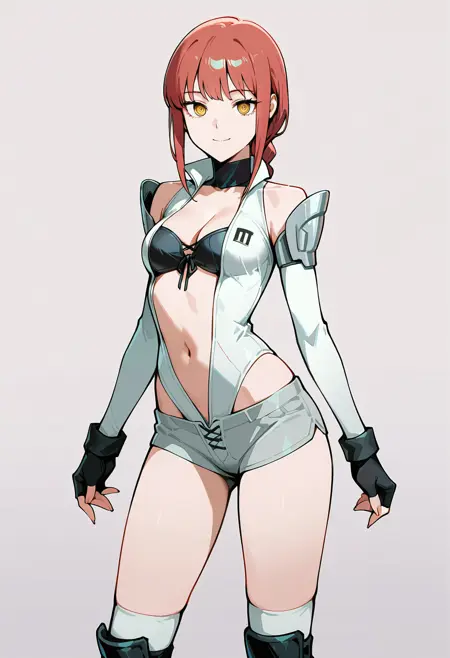 p4-fighter, bikini armor, leotard, black bandeau bikini top, bikini top only, detached sleeves, white sleeves, gray short shorts, choker, navel, fingerless gloves, knee pads,