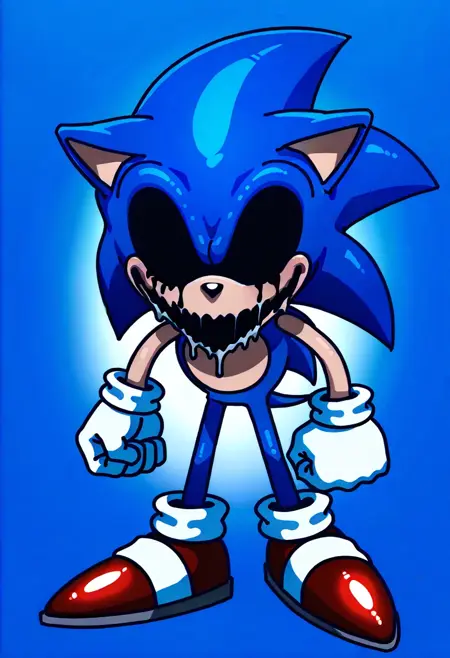 MelthogEXE, 1boy, sonic the hedgehog, blue fur, peach skin, two tone fur, hollow wyes, melted face, deformed face, deformed mouth, white gloves, red shoes, horror,