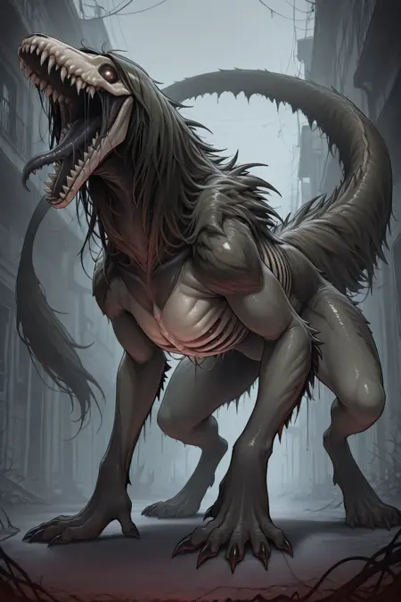 🔹 メインプロンプトSCP-682、怪物的な爬虫類、厚い鎧のような皮膚、発光する傷、露出した筋肉、再生する身体、発光する目(オプション:目なし)、巨大な顎、爪、尾、トゲ