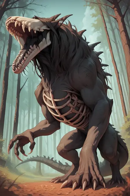 🔹 주 프롬프트SCP-682, 괴물 같은 파충류, 두꺼운 갑옷 같은 피부, 빛나는 흉터, 노출된 근육, 재생 중인 몸체, 빛나는 눈(옵션: 눈 없음), 거대한 턱, 발톱, 꼬리, 가시
